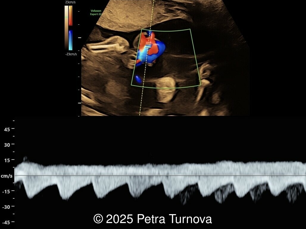 Cord entanglement can be visualized from the 12-13 weeks of pregnancy. The risk of cord events increases in cases of close cord insertion on the placenta. Some studies have confirmed that intermittent occlusion is associated with neurological morbidity, while prolonged occlusion is fatal. Ultrasound may visualize intertwined umbilical cords. On Doppler flow studies, intermittent or persistent notching of the umbilical artery may be present. This phenomenon is typically observed in abnormal uterine artery flow associated with placental insufficiency and is less frequently seen in umbilical artery flow disorders. Based on physical calculations, it has been shown that notching does not occur unless there is a reduction in tube diameter below 75%. Therefore, notching is present in cases of significant flow reduction.