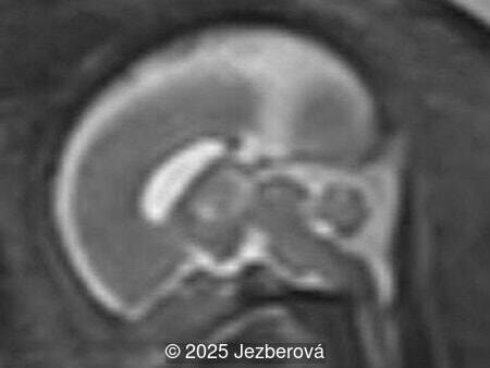 At 20 weeks, detailed ultrasound under conditions of severe oligohydramnios demonstrated absence of the typical box-shaped anechoic structure of the cavum septum pellucidum (CSP). The frontal horns of the lateral ventricles appeared narrow and pointed, giving the characteristic “bull’s horns sign.” Multiplanar and 3D reconstructions confirmed the presence of the corpus callosum, while the CSP was absent. Other midline and posterior fossa structures appeared normal. The optic chiasm was partially visualized, although assessment was limited by technical conditions. Fetal magnetic resonance imaging (MRI) was subsequently performed and confirmed isolated agenesis of the CSP with preserved corpus callosum and posterior fossa structures. The optic chiasm and pituitary stalk are visible in the sellar region, but the pituitary gland itself is not clearly identified in the sella turcica as it is a very small structure. No additional central nervous system anomalies were detected.