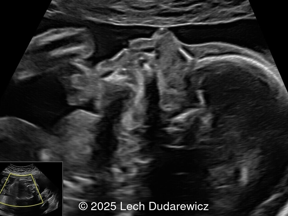 Fetal goiter is an enlargement of the thyroid gland, defined on ultrasound as a homogeneous, echogenic, symmetric mass in the anterior portion of the fetal neck [1]. It is the clinical manifestation of fetal thyroid gland dysfunction, which can be influenced by the maternal thyroid condition. Most cases are associated with maternal hyperthyroidism (Graves’ disease), but there are reports of fetal goiter in euthyroid mothers [2-4]. The effects of fetal thyroid goiter are both mechanical (mass effect) and biochemical [1, 5]. Due to the size and location of the mass, possible (though rare) complications include esophageal and tracheal compression, which can lead to polyhydramnios, dystocia during delivery, and neonatal respiratory compromise. The functional effects of thyroid goiter depend on its hormonal production. Most cases of hypothyroidism are asymptomatic until birth, presenting with impaired motor and intellectual development in later stages of life. In contrast, fetal hyperthyroidism presents with intrauterine growth restriction with accelerated bone maturation, tachycardia, and heart failure.