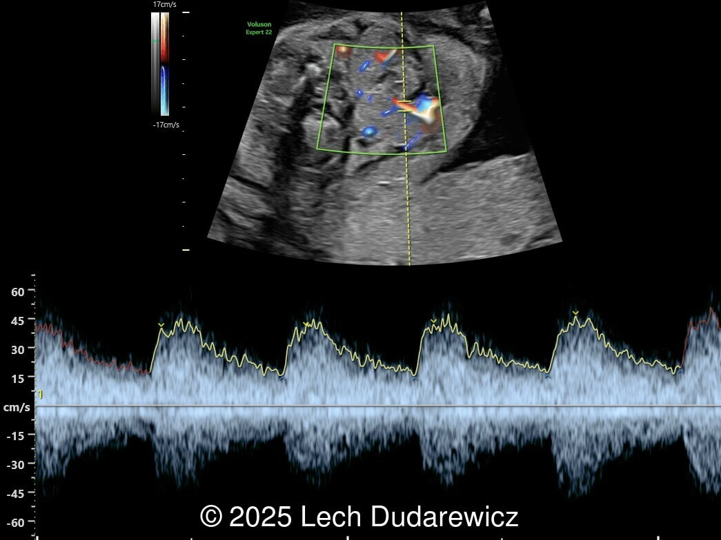 Ultrasound images demonstrated a symmetrically enlarged thyroid gland that was isoechoic to slightly hyperechoic relative to the surrounding tissues. Color Doppler revealed peripheral hypervascularization of the thyroid, known as the “peripheral vascular rim sign”. No internal parenchymal hyperperfusion was noted. Amniotic fluid volume was within normal limits and no structural anomalies were observed in the remainder of the scan.