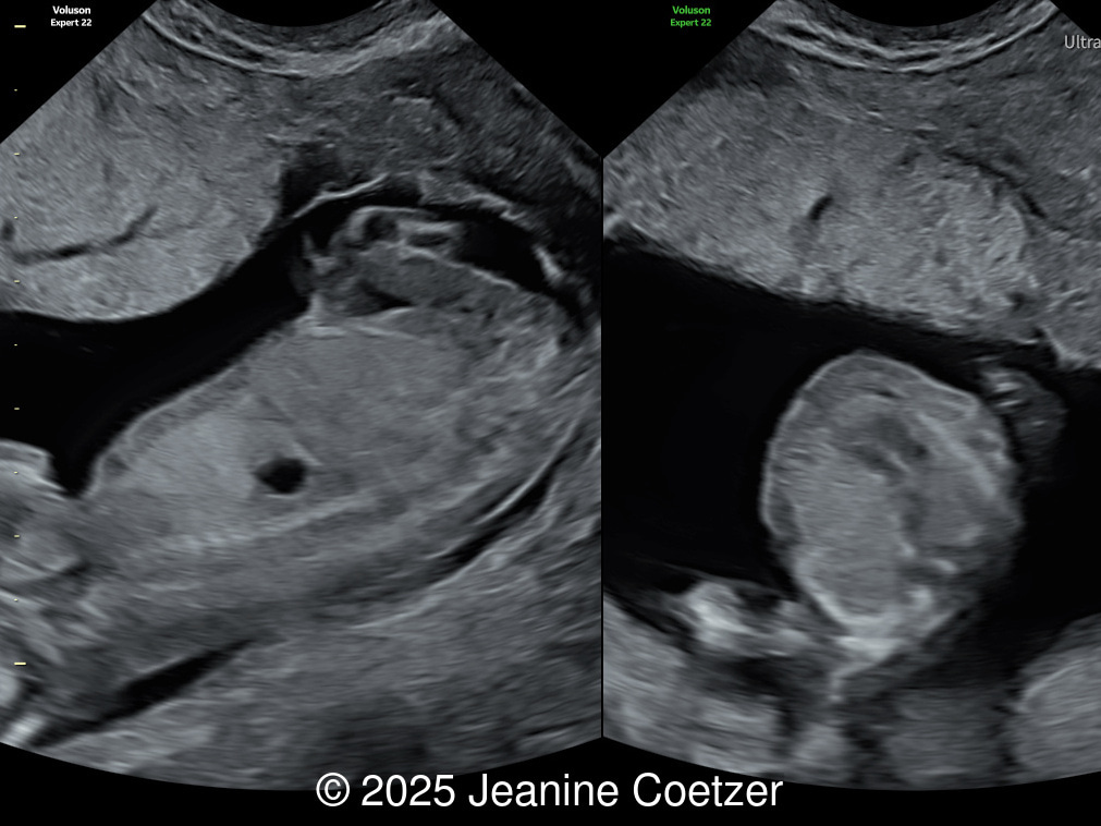 38-year-old woman with no significant previous medical history presented for her first scan at 13 weeks. This was her first pregnancy and was conceived through in vitro fertilization abroad.