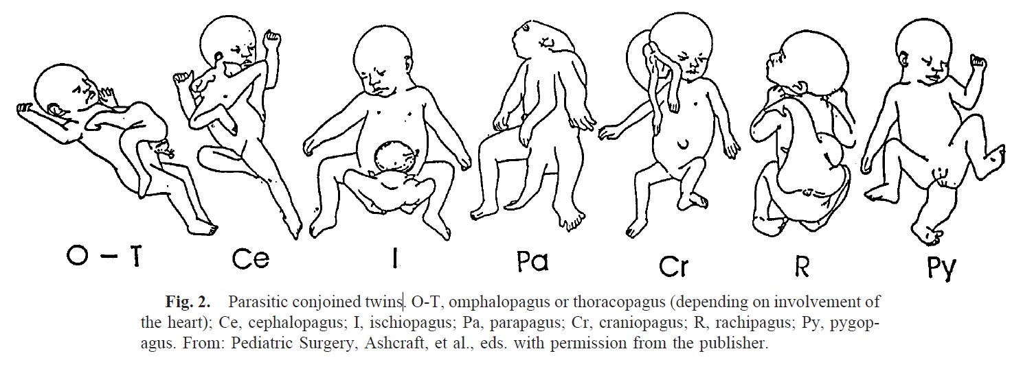 Intact conjoined twins consist of two essentially complete fetuses united by one of eight anatomic sites, designated by the Greek root pagus, meaning “that which is fixed”. Ventral unions are categorized as cephalopagus (head to umbilicus), thoracopagus (thorax), and omphalopagus (abdomen); the less frequent dorsal unions are classified as craniopagus (cranial vault), rachipagus (vertebral column), and pygopagus (sacrum), being called ischiopagus (pelvis) the caudal unions, and parapagus (body side) the lateral ones.